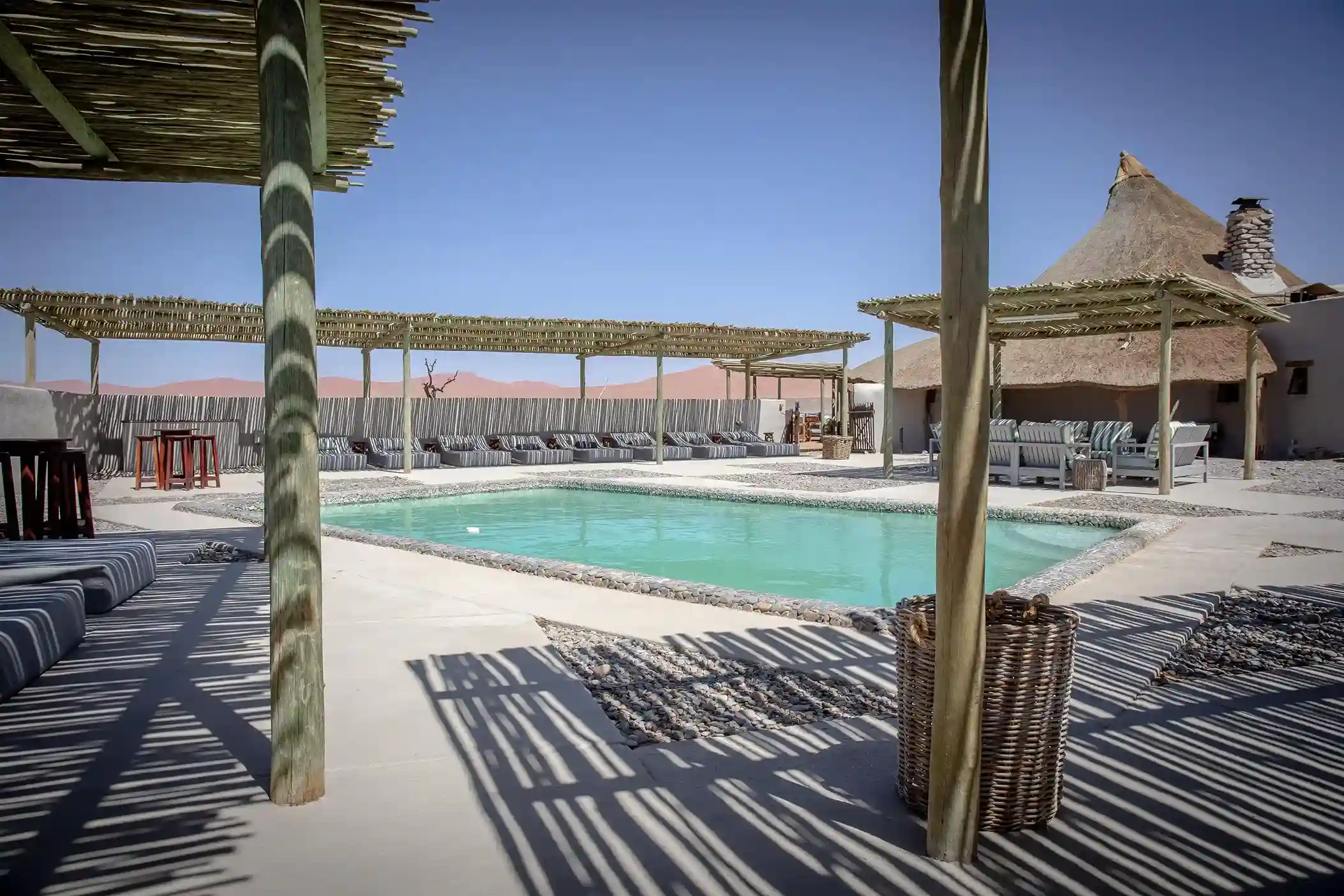 The main structures of the lodge have been constructed completely out of clay bricks in a North African design, with wrap-around verandahs that overlook the waterhole and surrounding desert landscape. 23 rustic and comfortable thatched and canvas tents, including three family units with wooden decks for ‘sleep-outs’ under the stars promises a desert experience that is nothing short of extraordinary.
