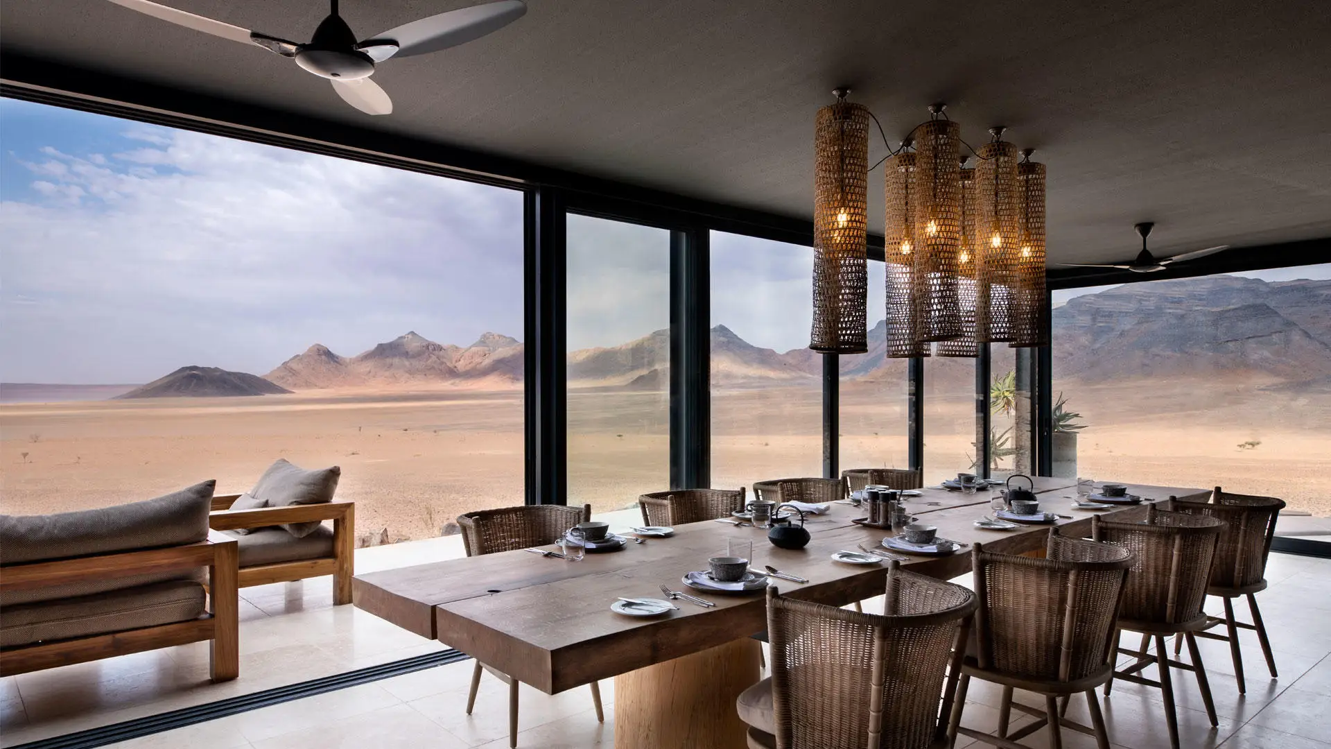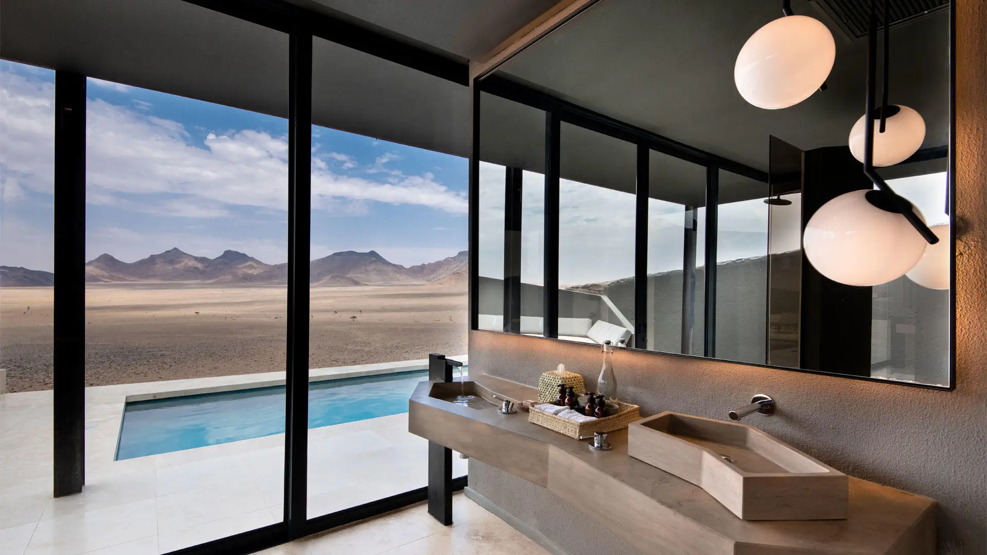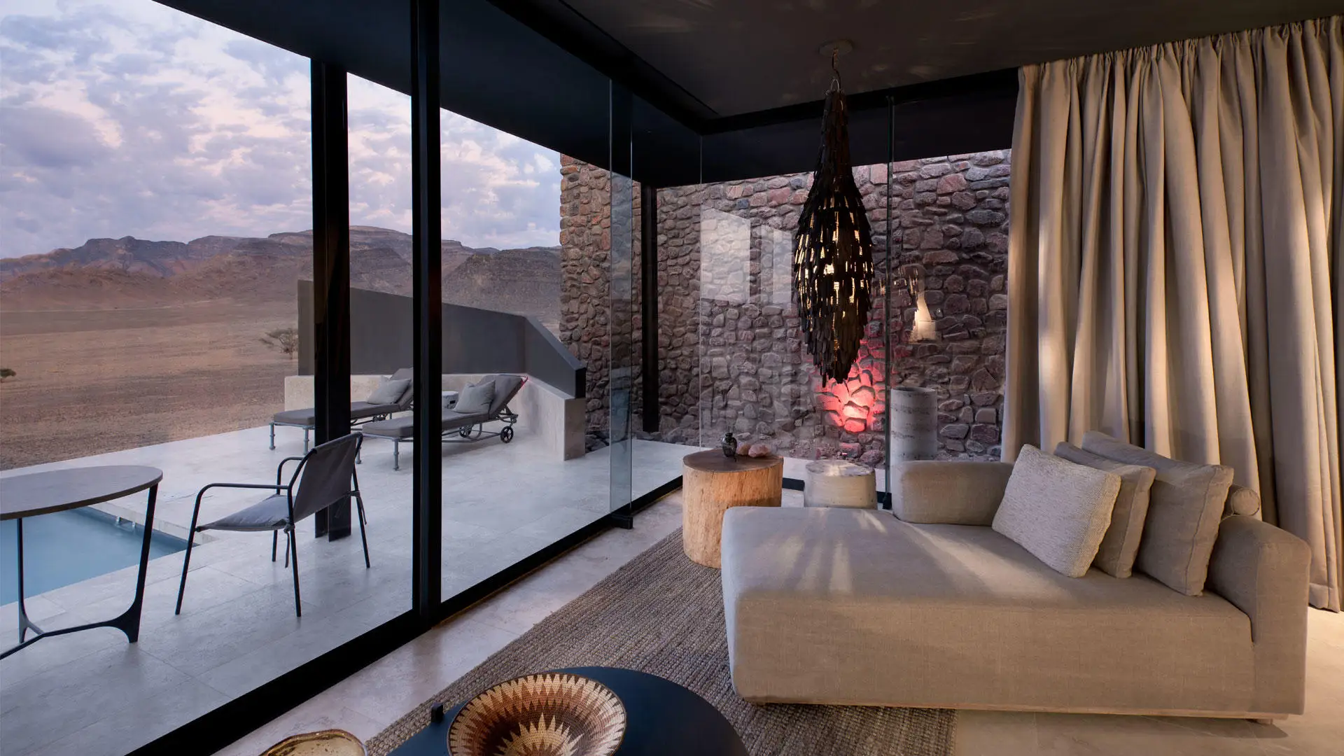 Along the arc of the escarpment, 10 exquisitely furnished and sustainability designed stone and glass suites open onto constant desert shifting views. Each extensive, air-conditioned suite features a living area with a fireplace, a broad retractable skylight above the bed, an ensuite bathroom with a glass-encased rain shower that offers 180º desert views, and a private terrace with a plunge pool.