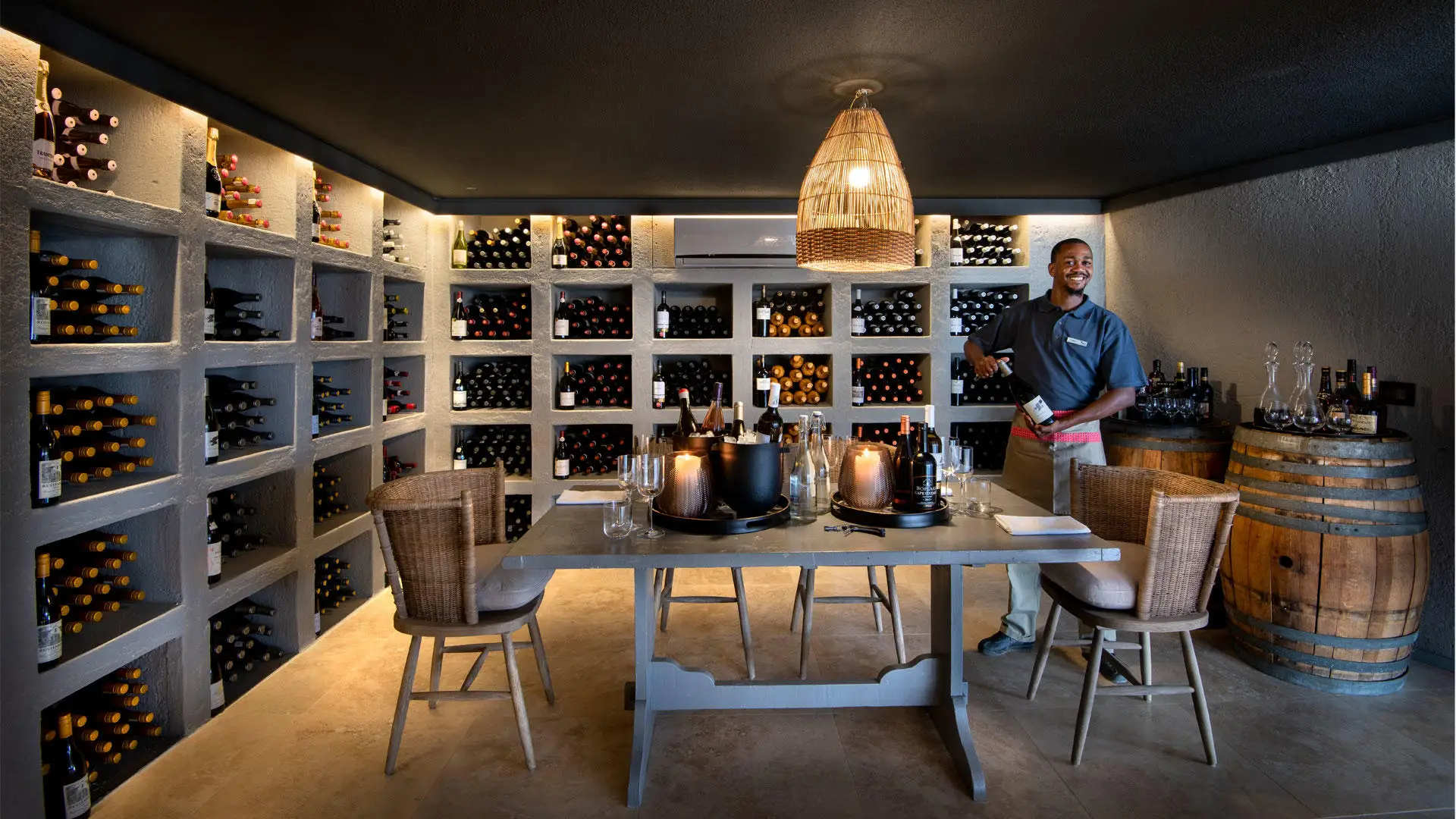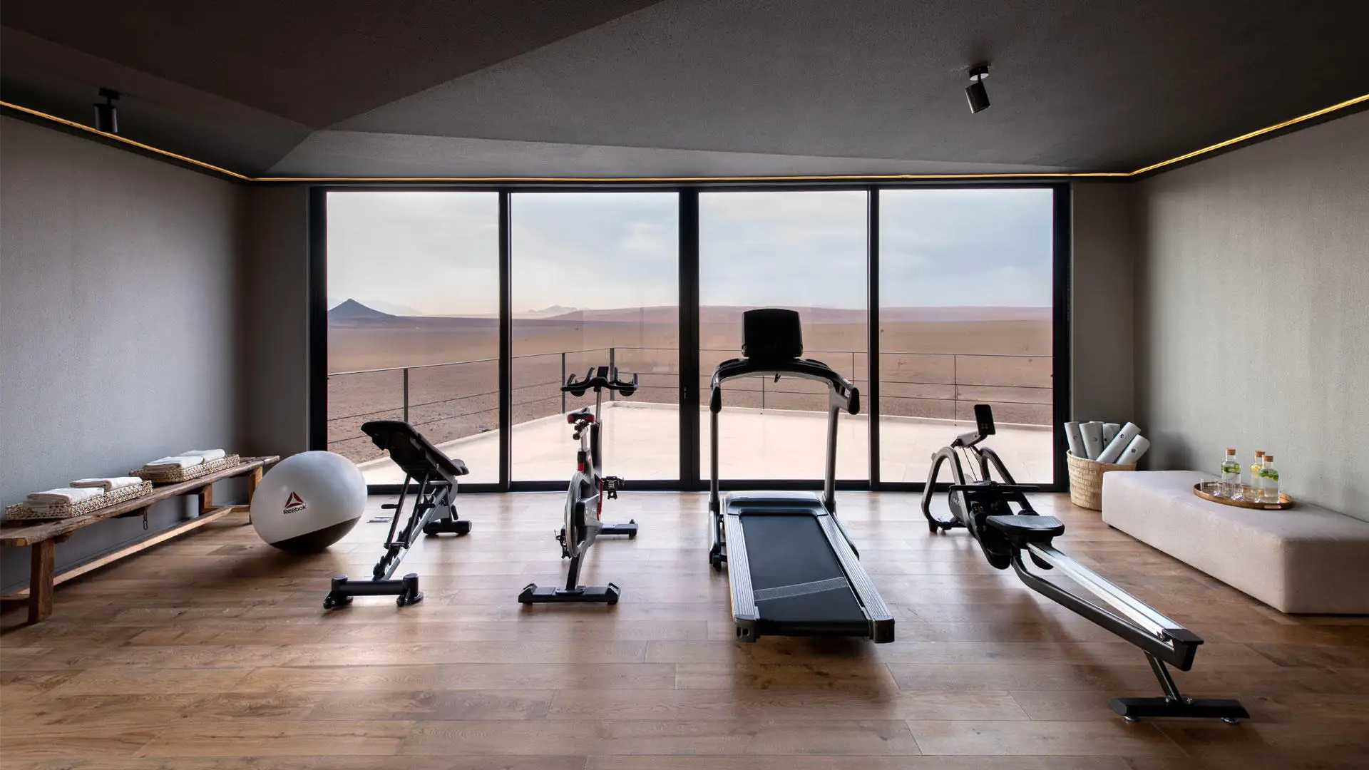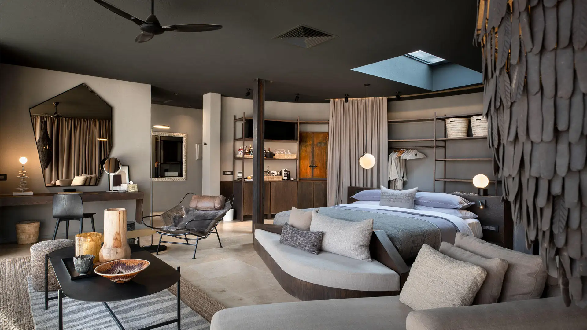 Along the arc of the escarpment, 10 exquisitely furnished and sustainability designed stone and glass suites open onto constant desert shifting views. Each extensive, air-conditioned suite features a living area with a fireplace, a broad retractable skylight above the bed, an ensuite bathroom with a glass-encased rain shower that offers 180º desert views, and a private terrace with a plunge pool.