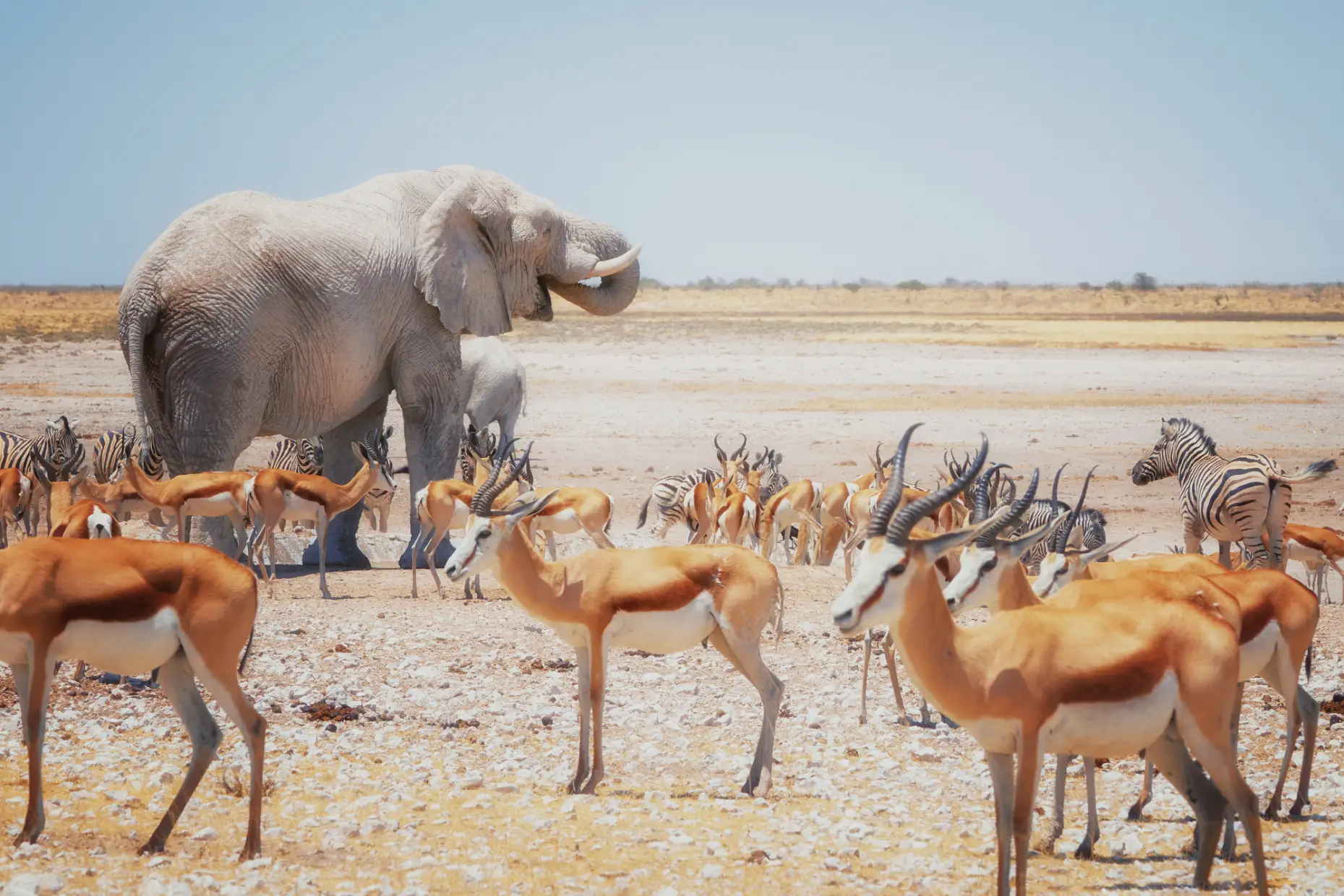 Namibia is a land sculpted by wind, time, and silence; where earth and sky meet in vast, otherworldly beauty. In the Namib Desert, towering red dunes rise like waves frozen in time. Along the Skeleton Coast, sea mist swirls over shipwrecks and seal colonies. Inland, desert-adapted wildlife roams the rocky plains of Damaraland, while ancient rock engravings echo the stories of early inhabitants. To the north, the salt pans of Etosha National Park draw elephants, lions, and vast herds to shimmering waterholes, offering some of the most dramatic wildlife scenes in Southern Africa. Whether soaring over Sossusvlei in a light aircraft or stargazing beside a crackling fire, Namibia offers a safari experience like no other.