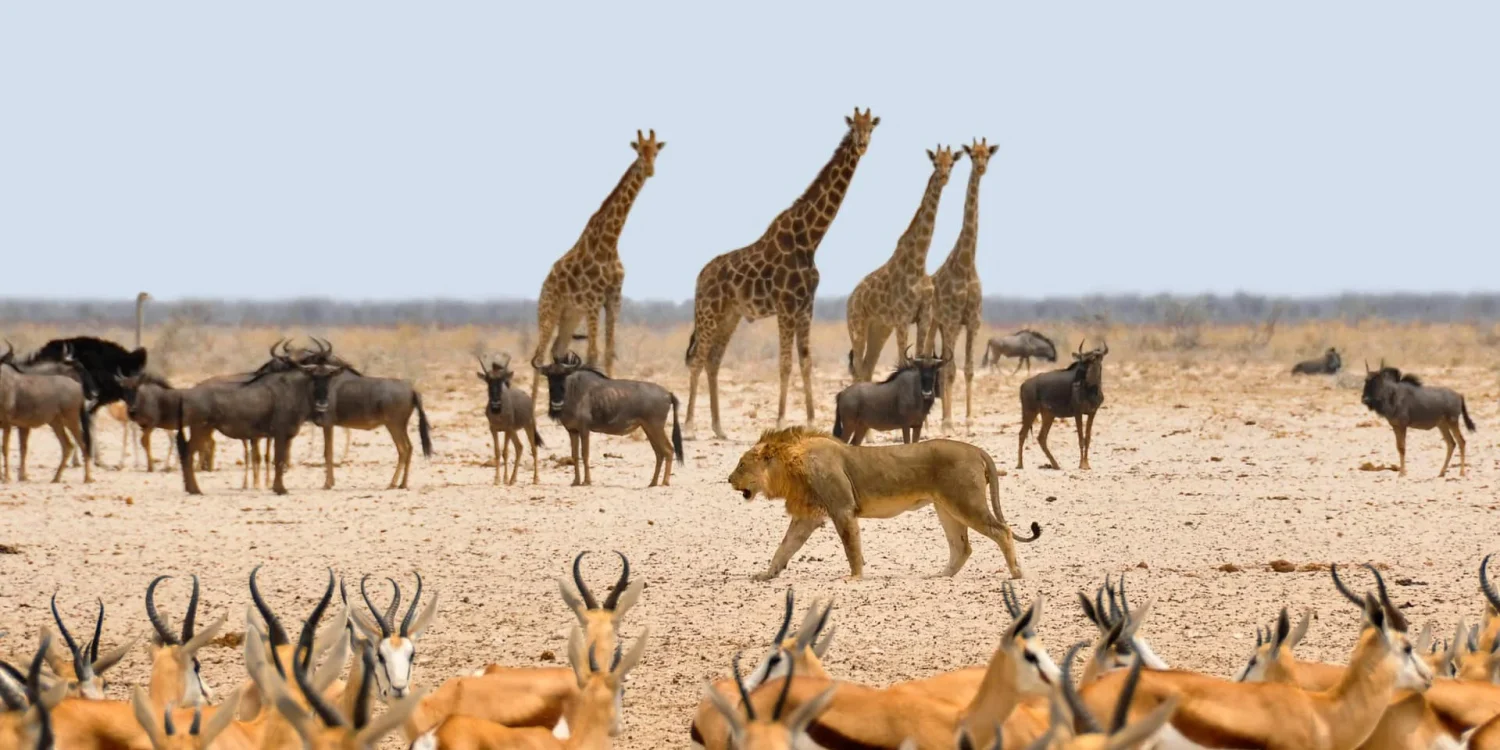 Etosha National Park is one of Africa’s best-known game reserves, famous for its striking salt pans and abundant wildlife, including elephants, lions, giraffes, and black rhinos. The park’s waterholes provide excellent wildlife viewing year-round, making it ideal for this on a first safari.